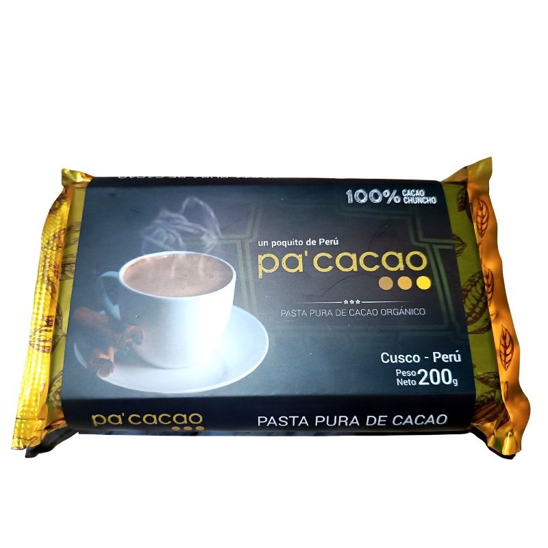 Pacacao – Barra de Chocolate para Taza 400g. Elaborada con Cacao Chuncho, originario de Echarati – Pachiri. 100% natural, aroma intenso, sabor auténtico, tradición ancestral, antioxidantes, energía saludable. Ideal para preparar chocolate caliente, repostería y postres. Calidad premium directo del productor. Delivery gratis en todo Cusco
